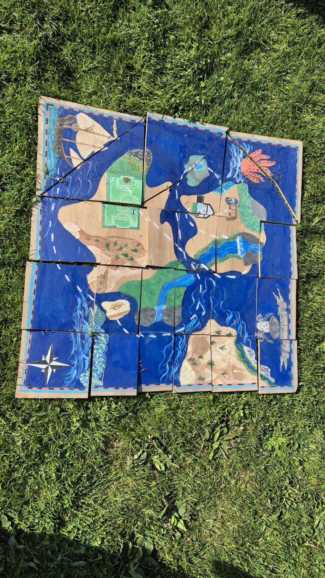Das Ziel der Strecke war unser SVA Sportplatz, bei dem dann alle 3 Gruppen noch gemeinsam 3 Aufgaben zu lösen hatten. Als erstes mussten unbedingt noch die fehlenden Schatzkarten Teile auf dem SVA Gelände gefunden werden. Dann die Karte richtig zusammen legen, (was gar nicht so einfach war), um endlich die gut gefüllte Schatzkiste mit süßen Leckereien finden zu können.